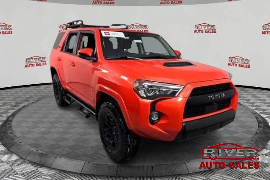 2023 Toyota 4Runner TRD Pro, Exterior, Rear lip spoiler, 3 underbody skid plates, Fully galvanized steel body panels with side impact beams, 4 doors, Body-colored front bumper, Front tow hook, Body-colored rear bumper, Body-colored fender flares, Black grille, Black side window trim, Body-colored door handles, Clearcoat paint, Monotone paint, Exterior badging, Wheel security locks, Full-size spare tire with steel wheel, Crank-down spare tire, Standard style side mirrors, Trailer towing capability, Trailer wiring harness, Class III tow rating, Trailer hitch, 17 x 7-inch front and rear black TRD aluminum wheels, P265/70SR17 AT BSW front and rear tires, First-row sliding and tilting glass sunroof with express open/close activation sunshade, Interior, 5, Bucket front seats, Heated driver and front passenger seats, Driver seat with 8-way directional controls, Driver seat with 2-way power lumbar, Front passenger seat with 4-way directional controls, Height adjustable front seat head restraints, Manual front seat head restraint control, Anti-whiplash front seat head restraints, Fixed rear seats, Manual reclining rear seats, Split-bench rear seat, Fold forward rear seatback, 40-20-40 folding rear seats, Height adjustable rear seat head restraints, Manual rear seat head restraint control, 3 rear seat head restraints, SofTex leatherette front seat upholstery, Leatherette front seatback upholstery, Leatherette door trim insert, Cloth headliner material, Full headliner coverage, Full carpet floor covering, Metal-look instrument panel insert, Leather gear shifter material, Mechanical, Front mounted engine, Regular Unleaded, Spark ignition system, Longitudinal mounted engine, Aluminum engine block, Aluminum cylinder head, Alternator, Lead acid battery, Radiator, 5-speed automatic, Overdrive transmission, ICE, Multi-Terrain Select selectable mode transmission, Transmission oil cooler, Multi-Mode part and full-time 4WD, Four-wheel drive, A-TRAC all-speed ABS and driveline traction control, Manual transfer case shift, Off-road ride suspension, Independent front suspension, Double wishbone front suspension, Front anti-roll bar, TRD front coil springs, Heavy-duty front springs, FOX shock absorbers, Safety, Electronic stability control system, 4-wheel disc brakes, 4-wheel antilock (ABS) brakes, Brake assist system, Hill descent control, Projector beam headlights, LED low and high beam headlights, Auto off headlight control, Daytime running lights, Multiple enclosed headlights, High mounted center stop light, Remote activated perimeter approach lighting, LED brake lights, Driver front impact airbag, Seat mounted side impact driver airbag, Curtain first, second and third-row overhead airbags, Passenger front impact airbag, Seat mounted side impact front passenger airbag, Airbag occupancy sensor, Driver and passenger side knee airbag, 8 airbags, Rear seat center 3-point seatbelt, Front height adjustable seatbelts