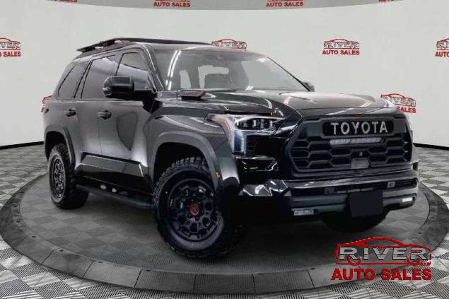2023 Toyota Sequoia TRD Pro, Navigation system, Lane departure, Automatic temperature control, Emergency communication system, Power moonroof, Premium audio system, Wireless phone connectivity, Parking sensors, Exterior parking camera front, Exterior parking camera left, Exterior parking camera right, Exterior parking camera rear, Front dual zone A/C, Auto high-beam headlights, Headlight cleaning, Auto-dimming rearview mirror, 3rd row seats, Split folding rear seat, Memory seat, Heated front seats, Ventilated front seats, Perimeter/approach lights, Remote keyless entry, Rear air conditioning, Heated steering wheel, Steering wheel mounted audio controls, Rear window wiper, Fully automatic headlights, Security system, Power driver seat, Power passenger seat, Alloy wheels, Heated door mirrors, Auto-dimming door mirrors, Roof rack, Trailer hitch receiver, Trailer sway control, Spoiler, Midnight Black Metallic 2023 Toyota Sequoia TRD Pro 4WD 10-Speed Automatic V6 Hybrid V6 Hybrid, 10-Speed Automatic, 4WD, ABS brakes, Active Cruise Control, Alloy wheels, Compass, Electronic Stability Control, Front dual zone A/C, Heated & Ventilated Front Seats, Heated door mirrors, Heated front seats, Illuminated entry, Low tire pressure warning, Navigation System, Power moonroof, Remote keyless entry, Traction control.